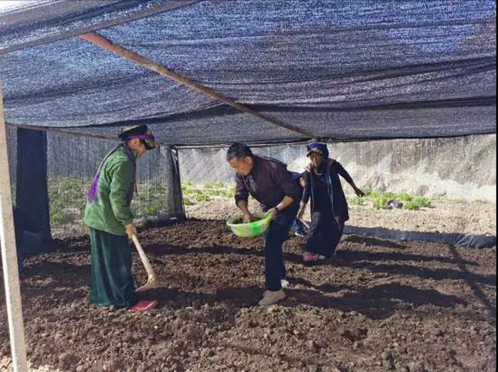 在大石凼村的種植試驗大棚里,我和石高讓木初、俄瑪頭等村民一起勞作